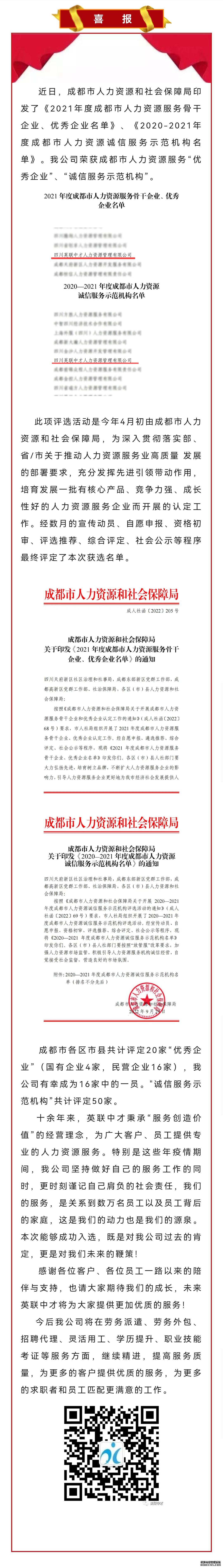 热烈祝贺英联中才荣获“优秀企业”、“诚信服务示范机构”荣誉