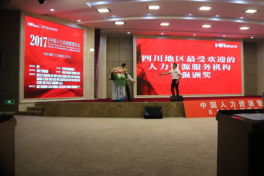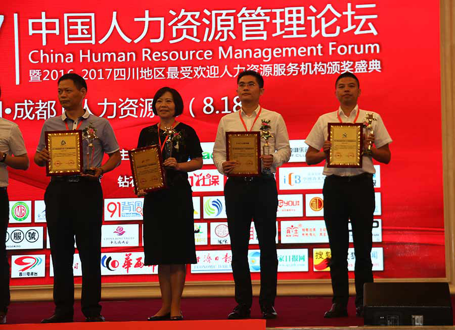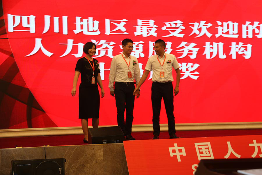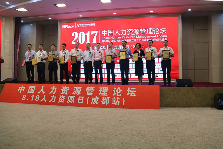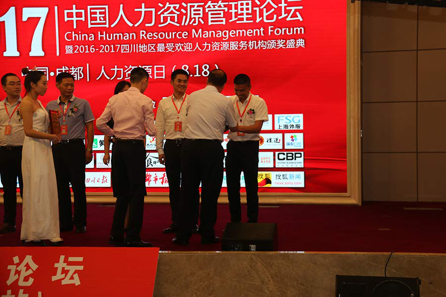 ![]() 由四川省人力资源服务行业协会指导,HRace四川人力资源俱乐部主办,成都人力资源服务行业协会和人力资源报协办的四川地区最受欢迎人力资源服务机构颁奖典礼于2017年8月18日在成都金融城CBP中央商务·国际会议厅隆重举行,此次颁奖典礼汇聚了众多四川人力资源服务企业,有800余位来自各行各业的人力资源管理者及企业主参与,我公司作为此次获奖公司之一,受邀参加了此次颁奖典礼。 ![]() 公司总经理旷发勇(右) 副总经理 温红(左)