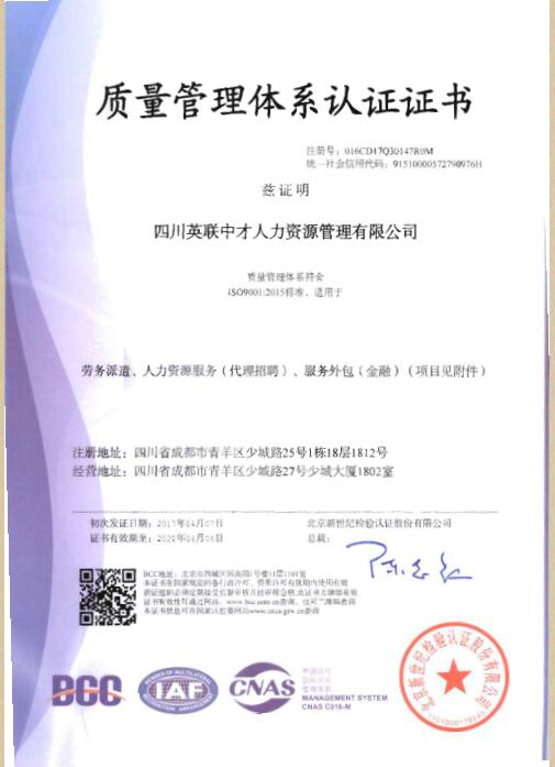 “以服务求生存,以质量求发展”,是我们一直提倡的理念,为了借鉴ISO9001质量体系的精髓,结合我公司实际情况,历时3个月,我公司在新世纪认证公司的协助和各部门主管级人员的通力配合下,顺利通过ISO9001质量认证并取得证书。因此建立了一整套劳务派遣、人力资源服务(代理招聘)和服务外包的管理体系。