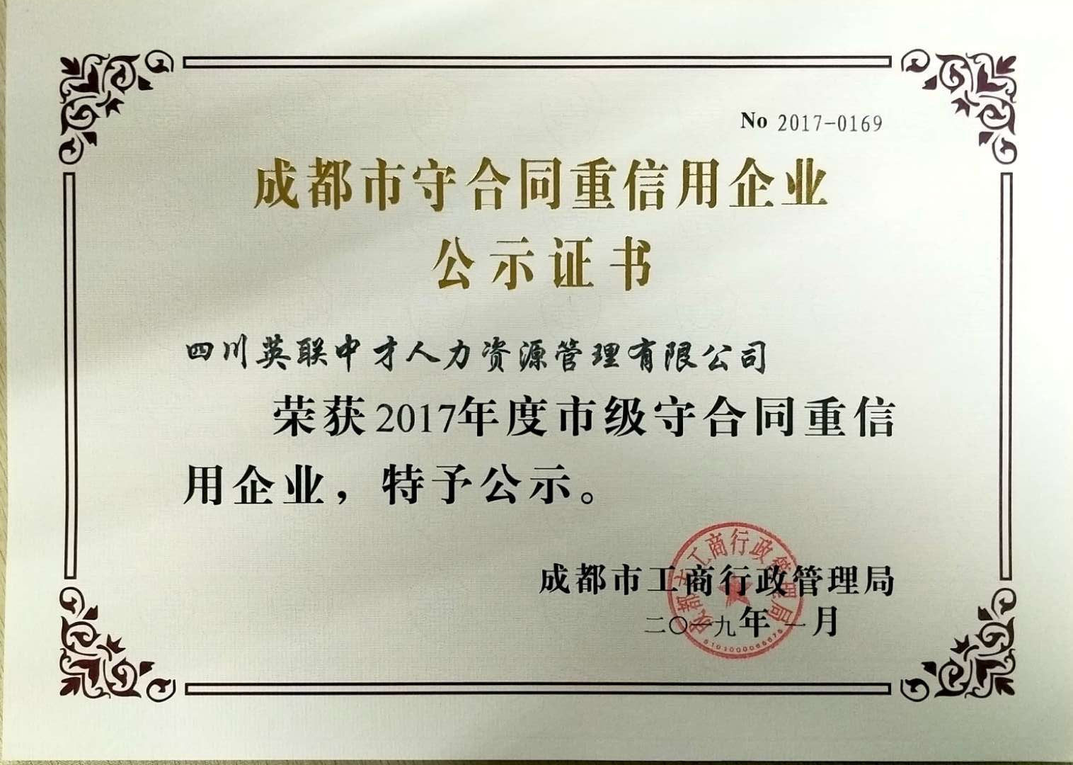 值此新春佳节来临之际,我公司荣誉簿上再添新成员,由成都市工商行政管理局,根据《四川省合同监督条例》《四川省守合同重信用企业公示办法》(川工商发〔2016〕53号)、《成都...