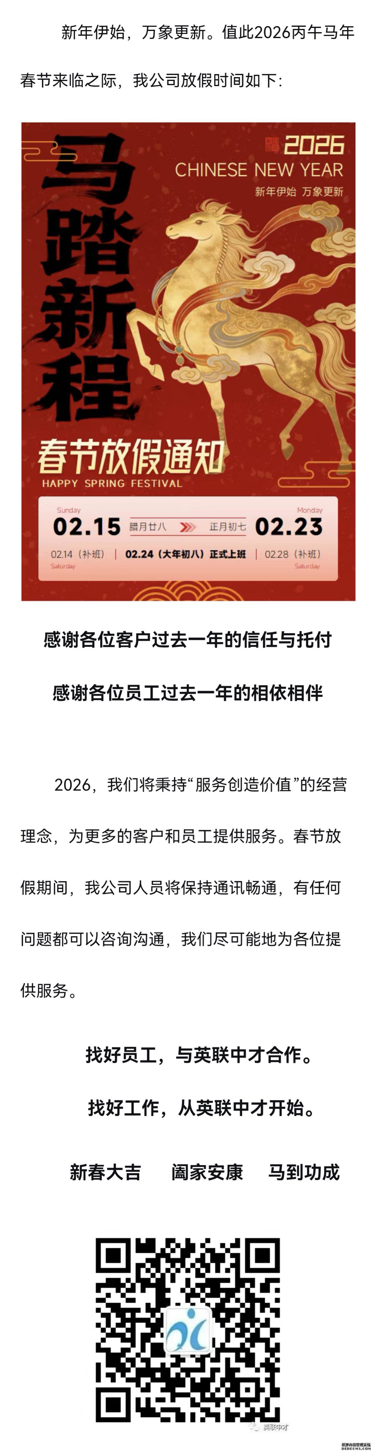 四川英联中才人力资源管理有限公司放假通知